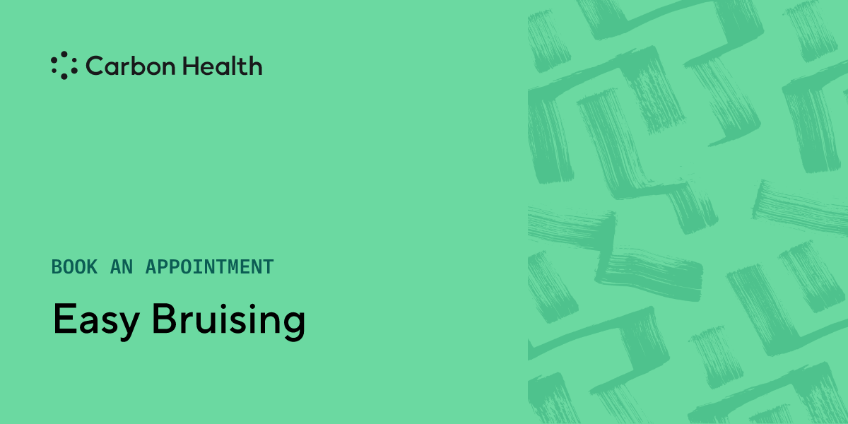 Easy bruising could indicate underlying severe issues, like those affecting your cardiovascular system. Schedule an appointment at a nearby Carbon Health if you are easily bruising.
